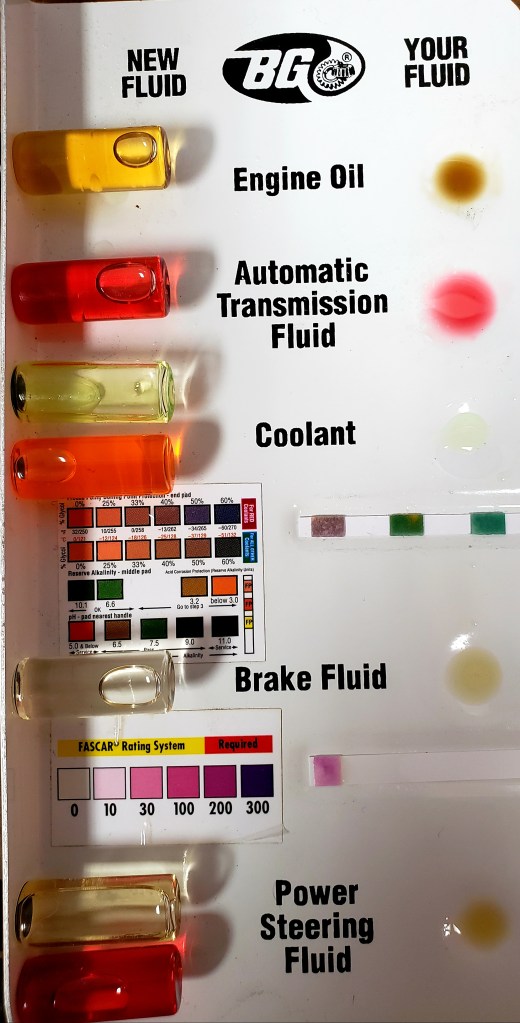 The fluid samples on the left show brand new fluid. The fluid samples on the right are fluids taken from a vehicle. Test strips are used to tell if the fluid is still healthy, beyond using just sight and smell. Your owner’s manual tells you when to change these fluids. Change them before they become dirty and can no longer do their job!
