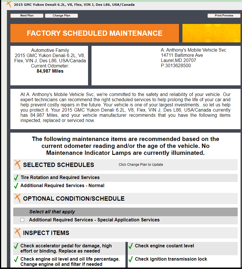 Here is what you get from me when I perform an Oil Service (at a minimum) or a Factory Scheduled Maintenance Service: a 2-mile pre service Test Drive, Battery Test, Fluid Sample Comparison, Digital Vehicle Inspection that covers 30 or more points on your car with pictures sent to you with a full health report, the Engine Oil Filter replaced, the Engine Oil replaced, Maintenance Reminder Light reset, Tire Pressure adjusted, and a 2-mile post service Test Drive. You receive a full estimate of items that require immediate attention and items that will need attention soon so you can stay on top of the health of your car.