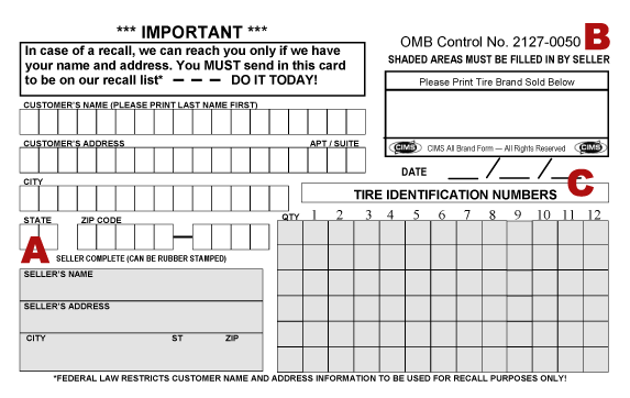 Apparently, only 1 in 5 defective tires are actually being taken off of the road through the safety recall processes that are in place. Now, I’m thinking how on earth can this be? Here is what I know: whenever you purchase tires (regardless of where you purchase them from) a card like the one pictured above should be filled out and mailed in. This is the only way tire manufacturers can notify you if there is a recall on your tires. The vendor (the shop or store who sold you the tires) should have this card, fill it out and mail it in for you. MAKE SURE TO ASK IF THIS HAS BEEN DONE! It could very well save your life.