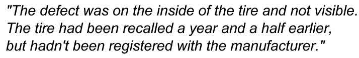 It was a typical Tuesday night in our family—we were all gathered in the living room waiting for Mama to finish cooking the meatballs. We sat around talking while the evening news played in the background. Here I am, mid-sentence and the news anchor breaks into a story about a nation-wide tire recall (watch the newscast http://abcnews.go.com/US/danger-wheels-feds-set-announce-tire-investigation-results/story?id=34757456 ) Seeing as a majority of my time is spent in the auto world, my attention naturally turned to the news. I was completely floored by this newscast–“more than half—56%–of recalled tires remain in use.”