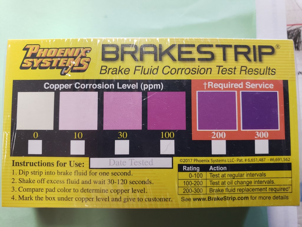 Using a test strip, the technician samples the brake fluid. The tip of the strip changes color. The darker the color, the more contaminated the fluid.
