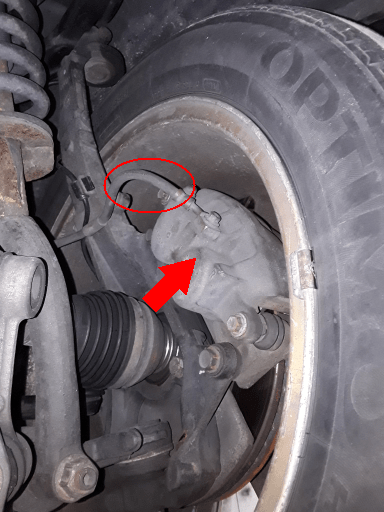 Inboard View of a Brake Assembly. Circled is the Brake Hose. The arrow is pointing to the Brake Caliper Assembly